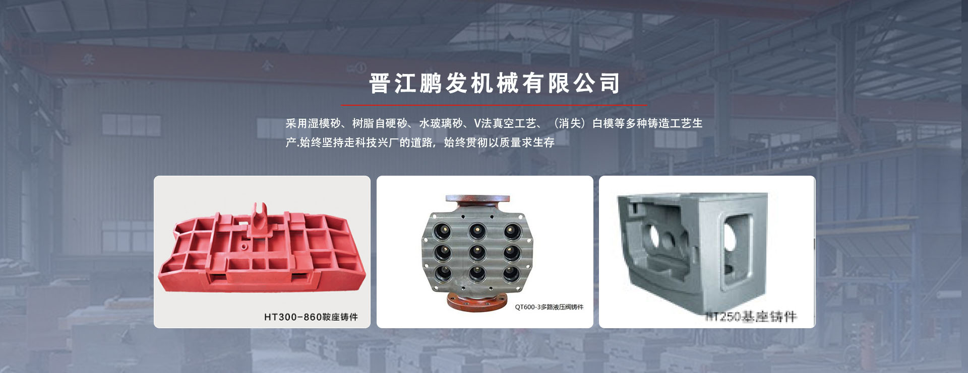 鵬發(fā)機械鑄造生產鞋機、大圓針織機、液壓機、數控機床、CNC加工中心配件。鵬發(fā)機械鑄造采用濕模砂、樹脂自硬砂、水玻璃砂、V法真空工藝、(消失)白模等多種鑄造工藝生產。鑄件材質有:多種牌號灰口鑄鐵、多種牌號球墨鑄鐵、鑄鋼件,同時也生產低合金鋼、高錳鋼等材質鑄件。員工120人,其中技術人員12人。具有雄厚的技術力量、先進的檢測儀器及完善的管理體系。現(xiàn)有設備:2T中頻感應電爐3套6爐,雙臂樹脂自硬混砂機3套,S114混砂機3套,V法真空鑄造生產線造型工作臺6站,拋丸、水力清理鑄件5套,退火設備1條,爐前鐵液質量管理儀,高頻紅外碳硫分析儀,微機高速分析儀,熔煉測溫儀,布氏、洛氏硬度計,金相、拉力試驗機,光譜儀等生產、檢測設備齊全。